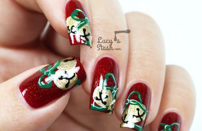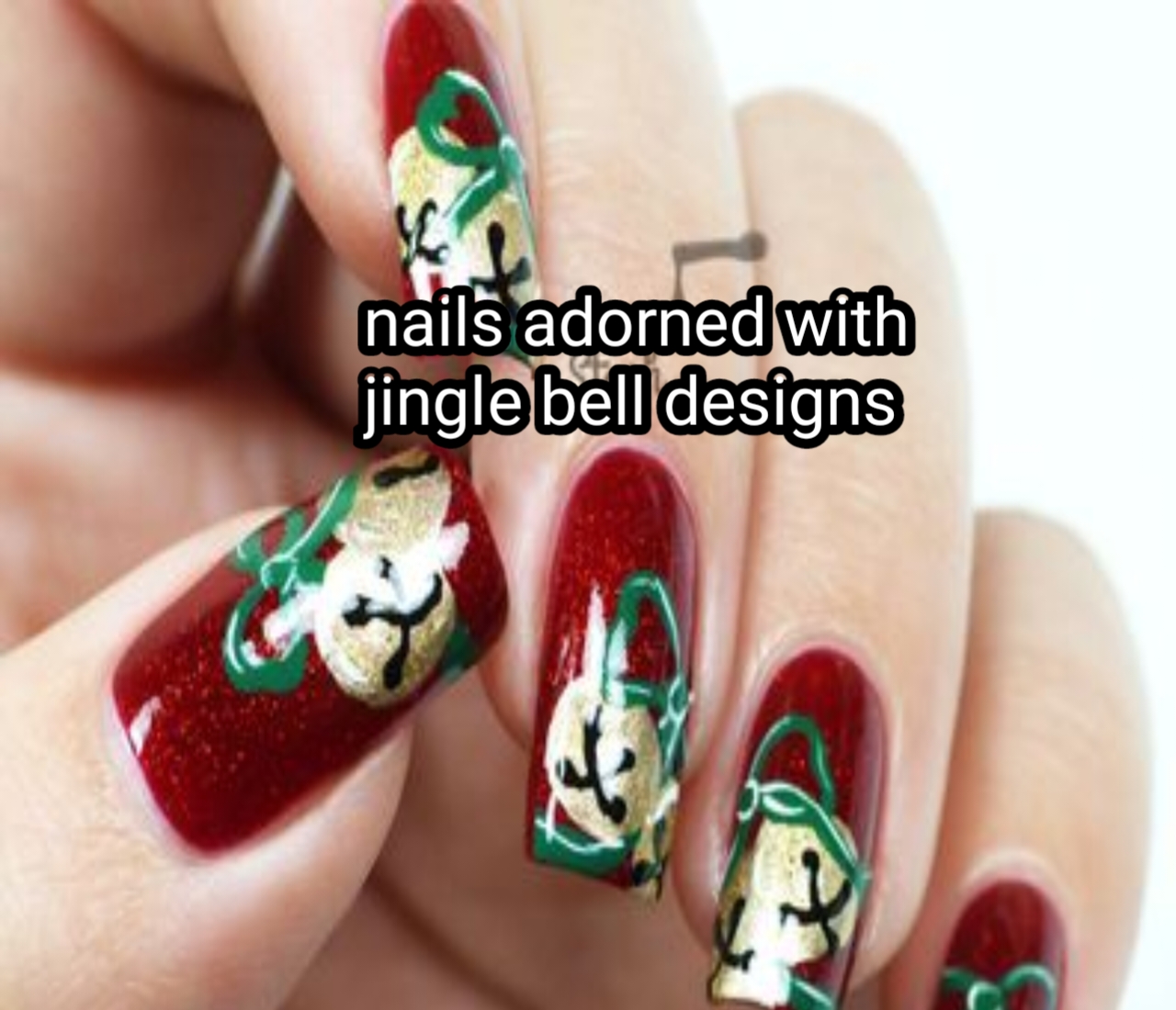 10. Jingle Bells - Description: Nail art showing jingle bells and holly.