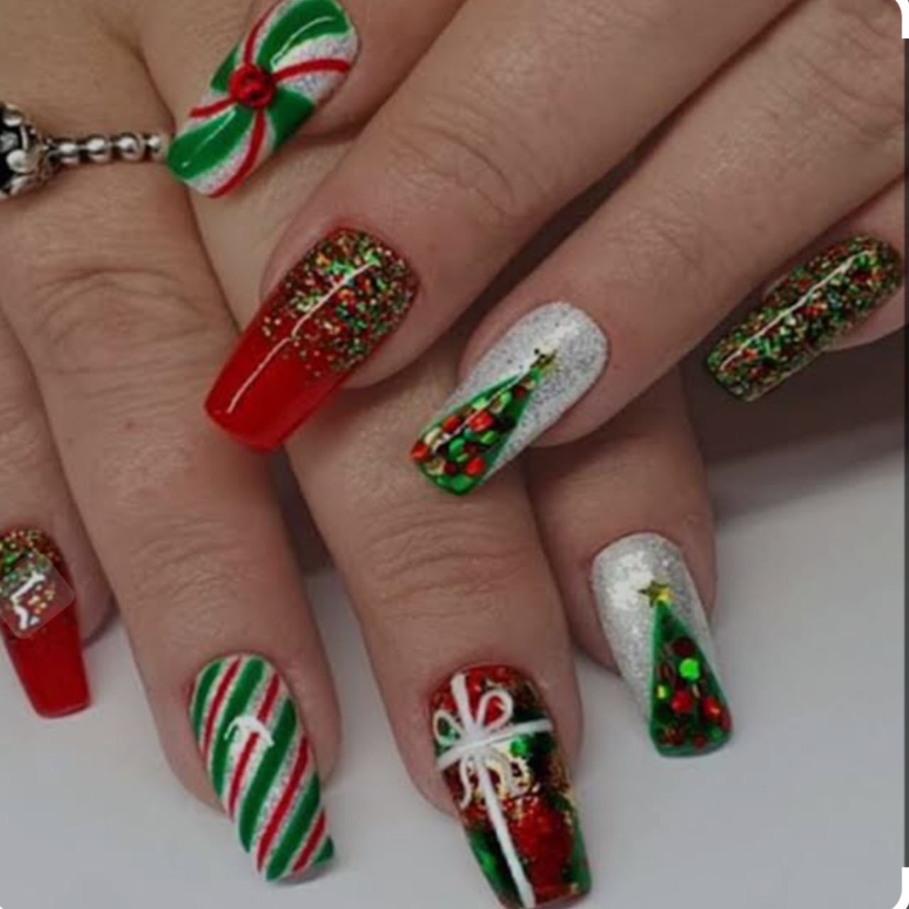 9. **Christmas Tree Art** - Description: Tiny Christmas trees painted on each nail.